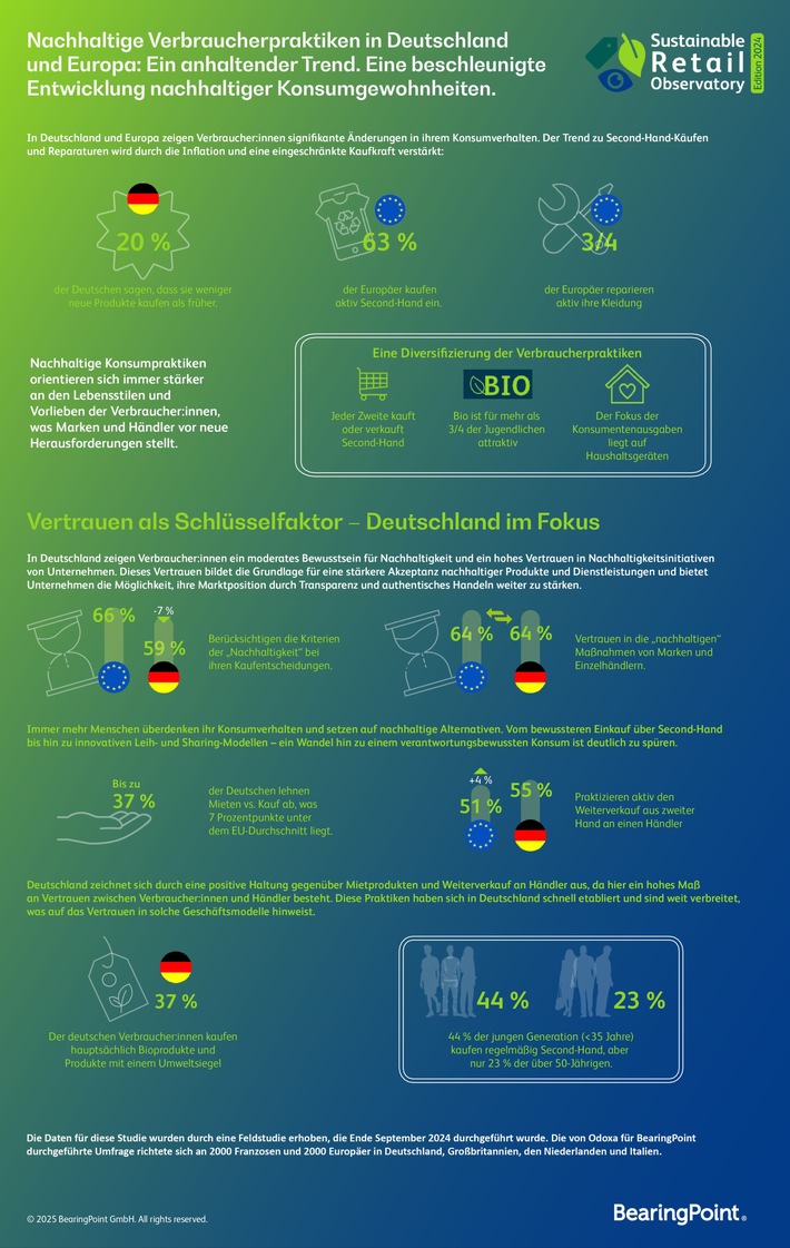 Bei der vorliegenden Untersuchung handelt es sich um die erste Ausgabe des von der Management- und Technologieberatung BearingPoint in Zusammenarbeit mit dem französischen Meinungsforschungsinstitut ODOXA realisierten Sustainable Retail Observatory. Für die Studie wurden die Verbraucherpraktiken in Deutschland, im Vereinigten Königreich, Frankreich, den Niederlanden und Italien genauer unter die Lupe genommen. Insgesamt 4.000 Personen wurden hierfür im Herbst 2024 zu ihren Verbraucherpraktiken befragt.