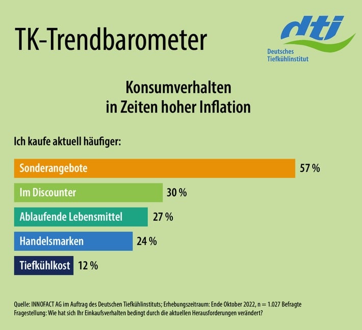 Die gestiegene Preissensibilität zeigt sich auch in einem geänderten Einkaufsverhalten: 57 Prozent an, häufiger als zuvor Sonderangebote zu kaufen, 30 Prozent besuchen öfter den Discounter, 27 Prozent greifen verstärkt zu Lebensmitteln mit ablaufendem Haltbarkeitsdatum und knapp jeder Fünfte (24 Prozent) wählt häufiger Handelsmarken. Zwölf Prozent entscheiden sich öfter für Tiefkühlprodukte.