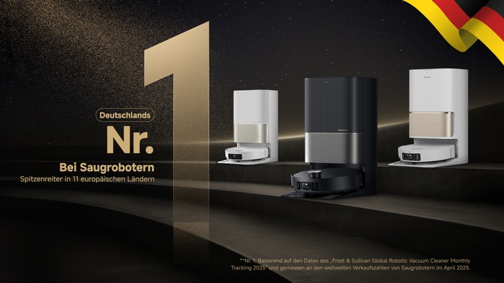 Das globale Beratungsunternehmen Frost & Sullivan veröffentlichte heute seinen Marktbericht für Saugroboter vom April 2025. Daraus geht hervor, dass Dreame Technology (https://375944.eu2.cleverreach.com/c/109267537/5e313c590-szsrmw) gemessen am Umsatz den ersten Platz im Markt für Saugroboter in Deutschland belegt. Der Bericht bestätigt außerdem die weltweite Führungsposition von Dreame: In 18 Ländern – darunter 11 in Europa, wie Deutschland, Frankreich, die Schweiz, Belgien und Italien – erreichte die Marke Platz 1. Dies unterstreicht den rasant wachsenden Einfluss von Dreame in der Region.