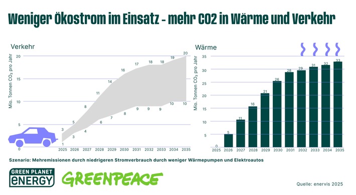 Die Studie des Beratungsinstituts Enervis im Auftrag von Greenpeace und Green Planet Energy zeigt: Wird der Ausbau von Wärmepumpen und Elektro-Autos weiter verschleppt, steigt der Stromverbrauch langsamer und die Erneuerbaren-Ziele könnten mit einem geringeren Ausbau fast erreicht werden. Was zunächst stimmig erscheint, ist jedoch eine Hiobsbotschaft für den Klimaschutz. Ruht sich die Bundesregierung auf dem schleppenden Ausbau von Elektroautos und Wärmepumpen aus, entstehen im Verkehrs- und Wärmesektor bis 2035 bis zu 381 Millionen Tonnen an zusätzlichen CO2-Emissionen – in etwa so viel wie Australien in einem Jahr verursacht. Die Folge wären Strafzahlungen Deutschlands an die EU, steigende CO2-Preise ab 2027 im Emissionshandel für Wärme und Verkehr sowie gesellschaftliche Folgekosten in Milliardenhöhe.